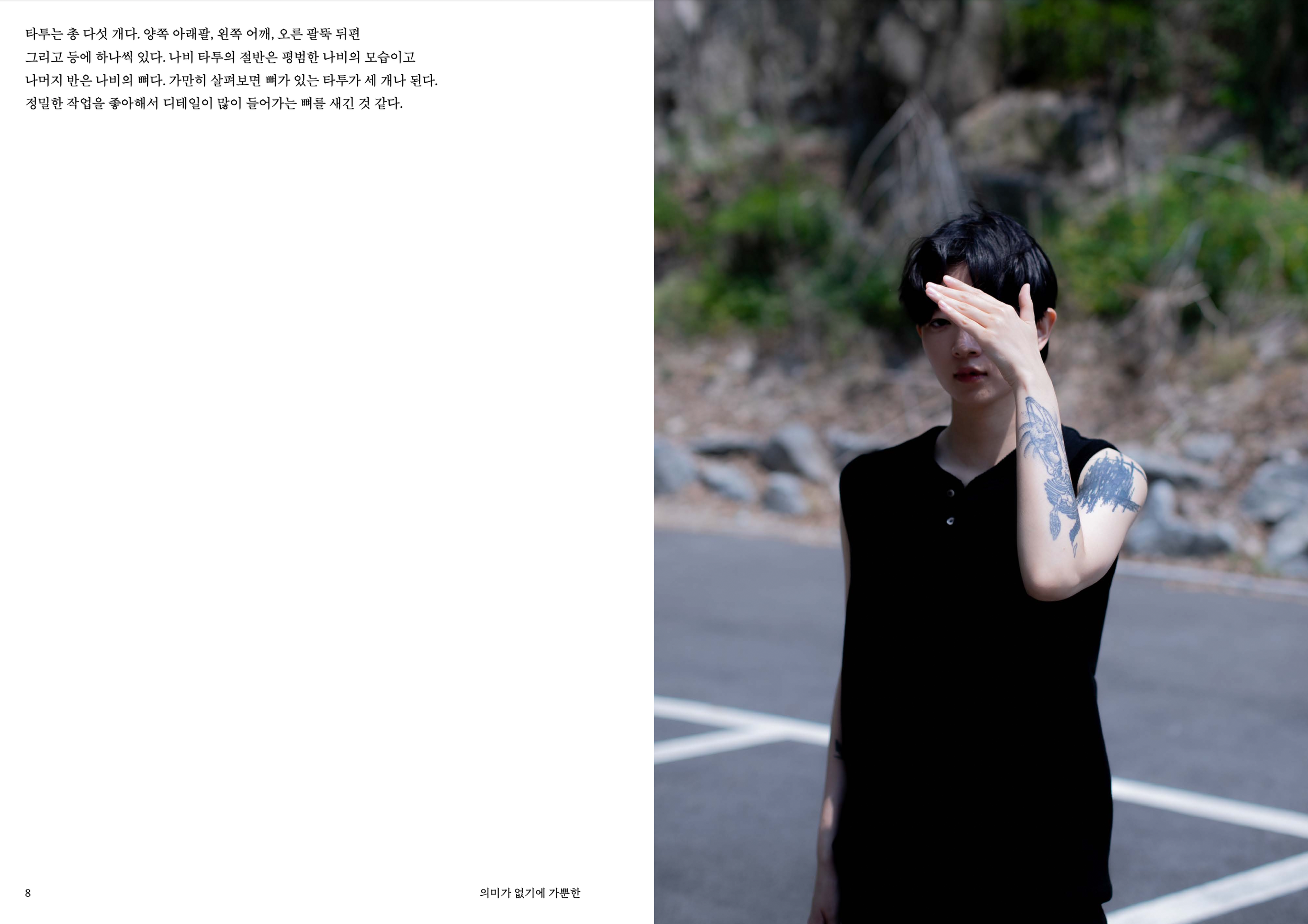 With the Brightest Black is a tattoo photobook by photographer Hankyung Ryu, published by Hankyoreh Publishing, that records ten interviewees and their tattoos. Poets, rappers, actors, photographers, tattoo artists and other non-male creators of this era appear in the book, along with the tattoos they have inscribed on their bodies and the life stories attached to them, presented through photographs and prose-style interview texts. The artist approaches tattoos not as simple decoration or a sign of deviance but as a site where wound and recovery, love and mourning, resistance to norms and self-affirmation are written into the body, following the question of how “the darkest black can become the brightest black.” The project began from a desire to reconsider the different social gazes directed at tattooed male and non-male, the legal and social conditions that still render tattooing illegal in South Korea, and the wish to read tattoos not as marks of regret or stigma but as a way of holding and remembering one’s own life. Drawing on his experience as a photographer who has spent a long time looking at and listening to other people’s bodies and stories, the author set out to gather into this book the desire to be “born again,” the sense that there is no going back to a former self, and the movement of choosing and defining one’s own body.